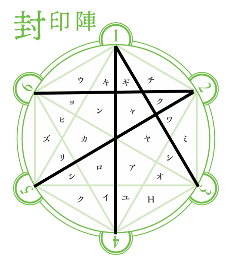2つの魔法陣の中央には「シ」「H」が反転した文字が見える。